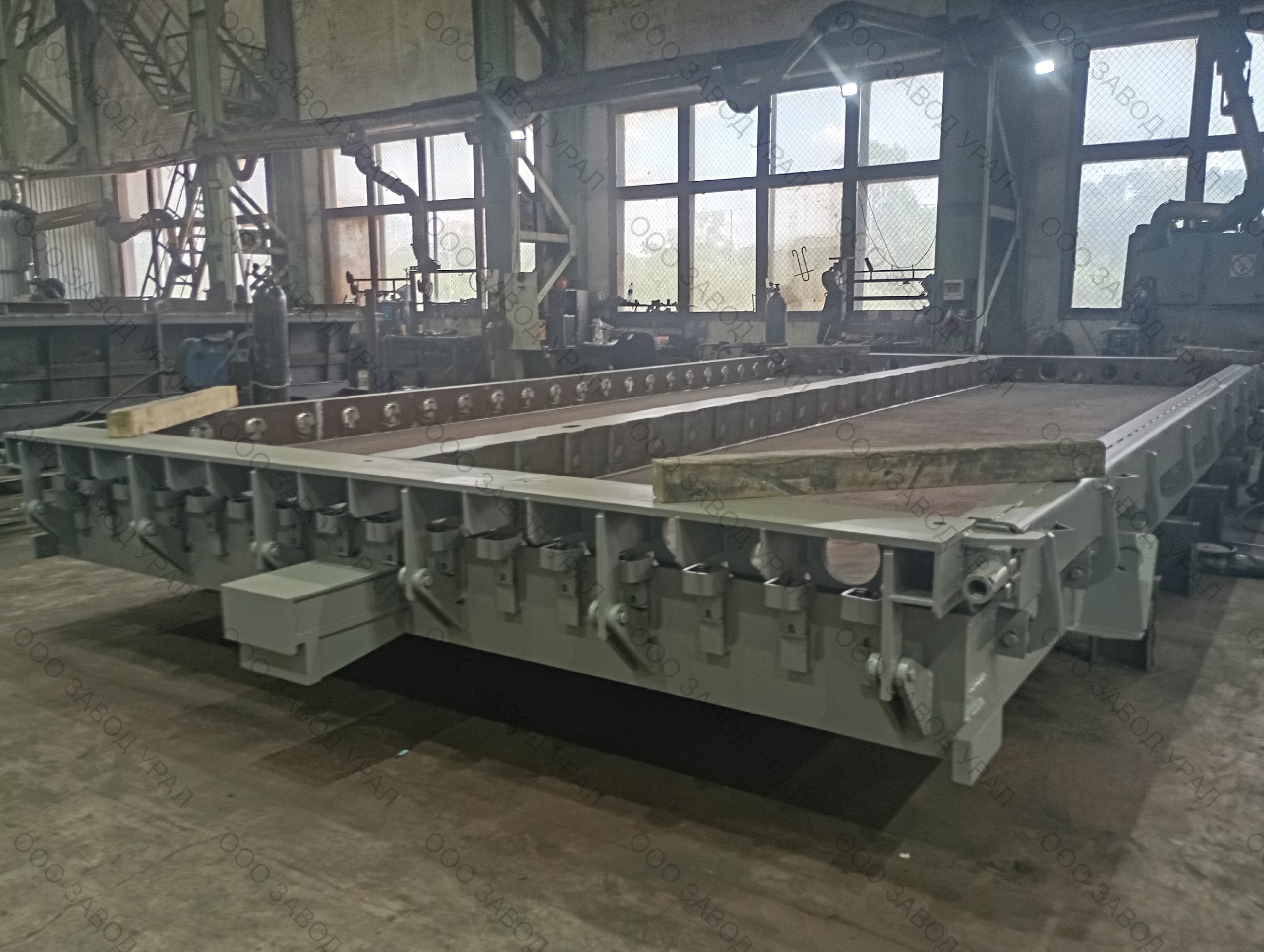 Металлоформы для производства плит перекрытия изготовлены по проекту заказчика. Ввиду того, что форма спроектирована сразу на два изделия, её ширина превысила допустимые габариты по выгрузке. Была спроектирована рама для вывоза формы под наклоном с последующим размещением на трале с помощью крана большой грузоподъемности.